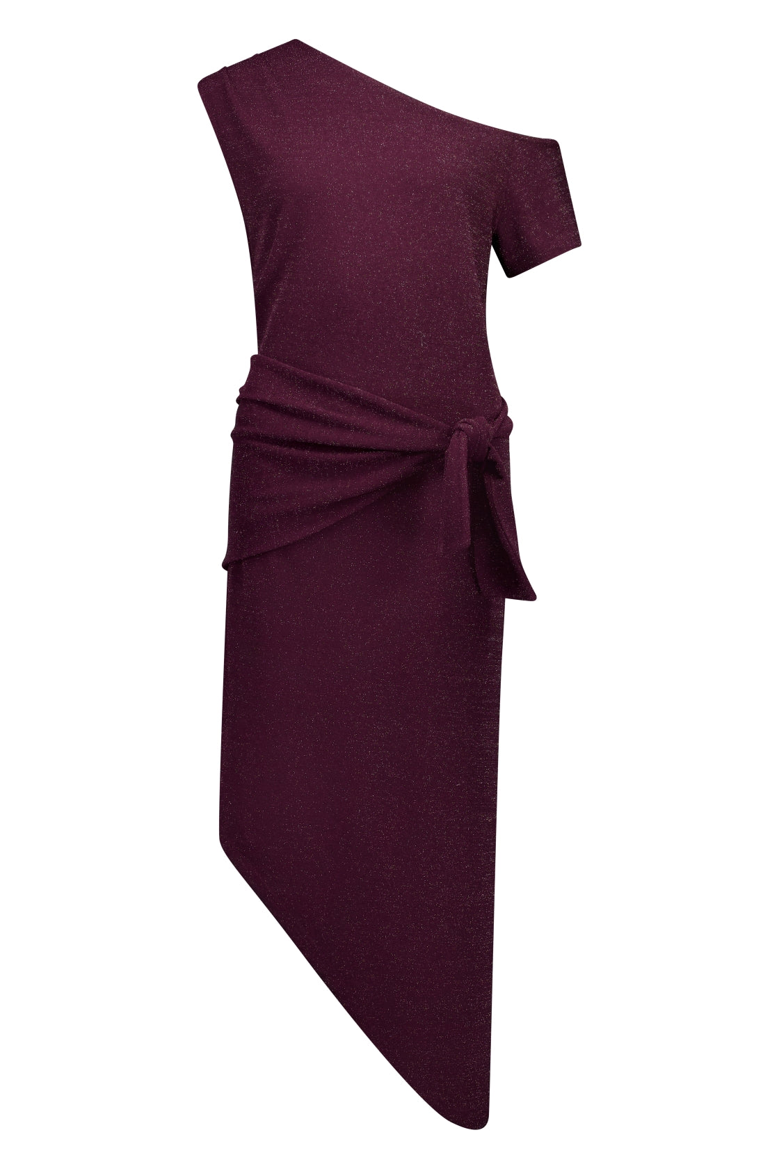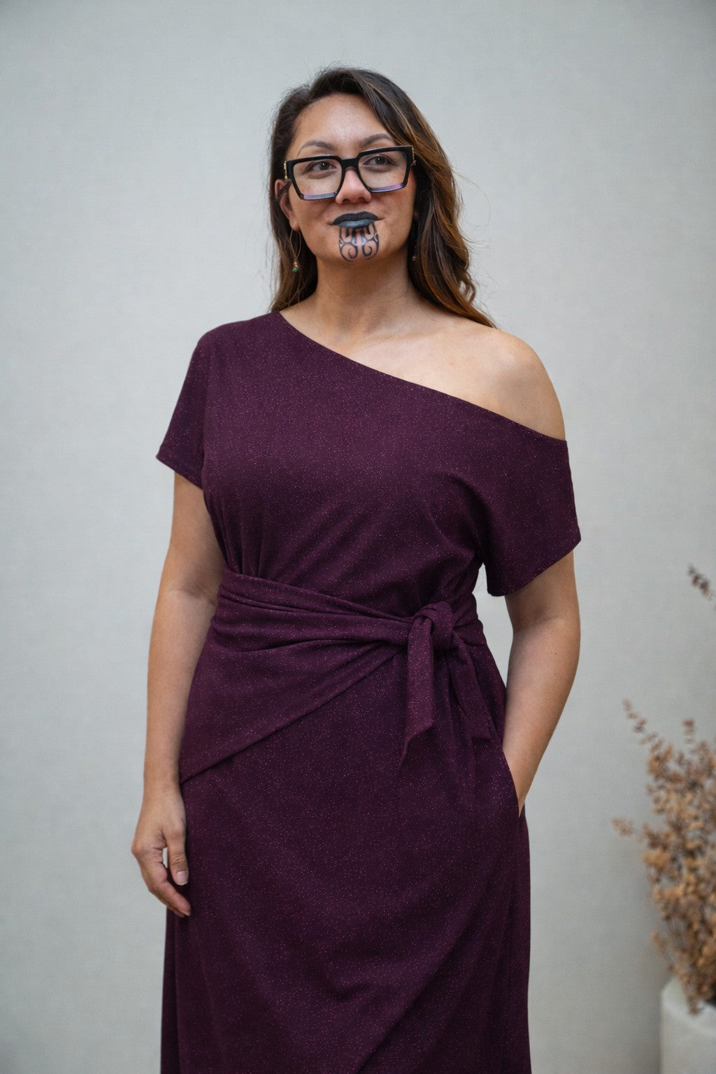 Kanapa - meaning “to shine” comes to life in this sparkling evening midi dress. The textured fabric, off-the-shoulder neckline, and side-attached wrap detail create a graceful, flowing silhouette.